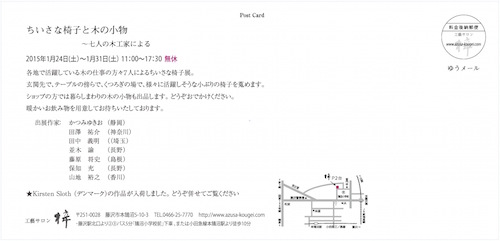 24 1月 2015 ちいさな椅子と木の小物 〜七人の木工家による by y.tanaka | posted in: お知らせ | 0 工芸サロン梓さんで、今日から開催です! 2015年1月24日〈土)~31日〈土)11時~17 時半 無休 工芸サロン梓 251-0028 藤沢市本鵠沼5-10-3 tel 0466-25-7770